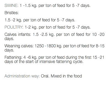SWINE: 1 -1.5 kg. per ton of feed for 5 -7 days. Bristles: 1.5 -2 kg. per ton of feed for 5 -7 days. POULTRY: 1-2 kg. per ton of feed for 5 -7 days. Calves infants: 1.5 -2.5 kg. per ton of feed for 10 -20 days. Weaning calves: 1250 -1800 kg. per ton of feed for 8-15 days. Fattening: 4 -6 kg. per ton of feed during the first 15 -21 days of the start of intensive fattening cycle. Administration way: Oral. Mixed in the food