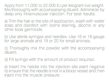 Apply from 11,000 to 22.000 IU per kilogram live weight. Mix thoroughly with accompanying diluent. Administer by deep only intramulscular injection. For best results: a) Trim the hair at the site of application, wash with water soap and disinfect with iodine staining, alcohol or any other local germicide. b) Use sterile syringes and needles. Use 16 or 18 gauge for large animals and 19 or 20 for small animals. c) Thoroughly mix the powder with the accompanying diluent. d) Fill syringe with the amount of product required. e) Insert the needle into the injection site exert negative to ensure that the needle is not in a blood vessel and then inject into the muscle pressure.