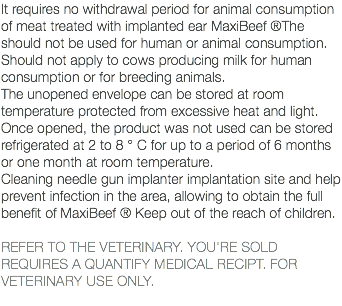 It requires no withdrawal period for animal consumption of meat treated with implanted ear MaxiBeef ®The should not be used for human or animal consumption. Should not apply to cows producing milk for human consumption or for breeding animals. The unopened envelope can be stored at room temperature protected from excessive heat and light. Once opened, the product was not used can be stored refrigerated at 2 to 8 ° C for up to a period of 6 months or one month at room temperature. Cleaning needle gun implanter implantation site and help prevent infection in the area, allowing to obtain the full benefit of MaxiBeef ® Keep out of the reach of children. REFER TO THE VETERINARY. YOU'RE SOLD REQUIRES A QUANTIFY MEDICAL RECIPT. FOR VETERINARY USE ONLY.